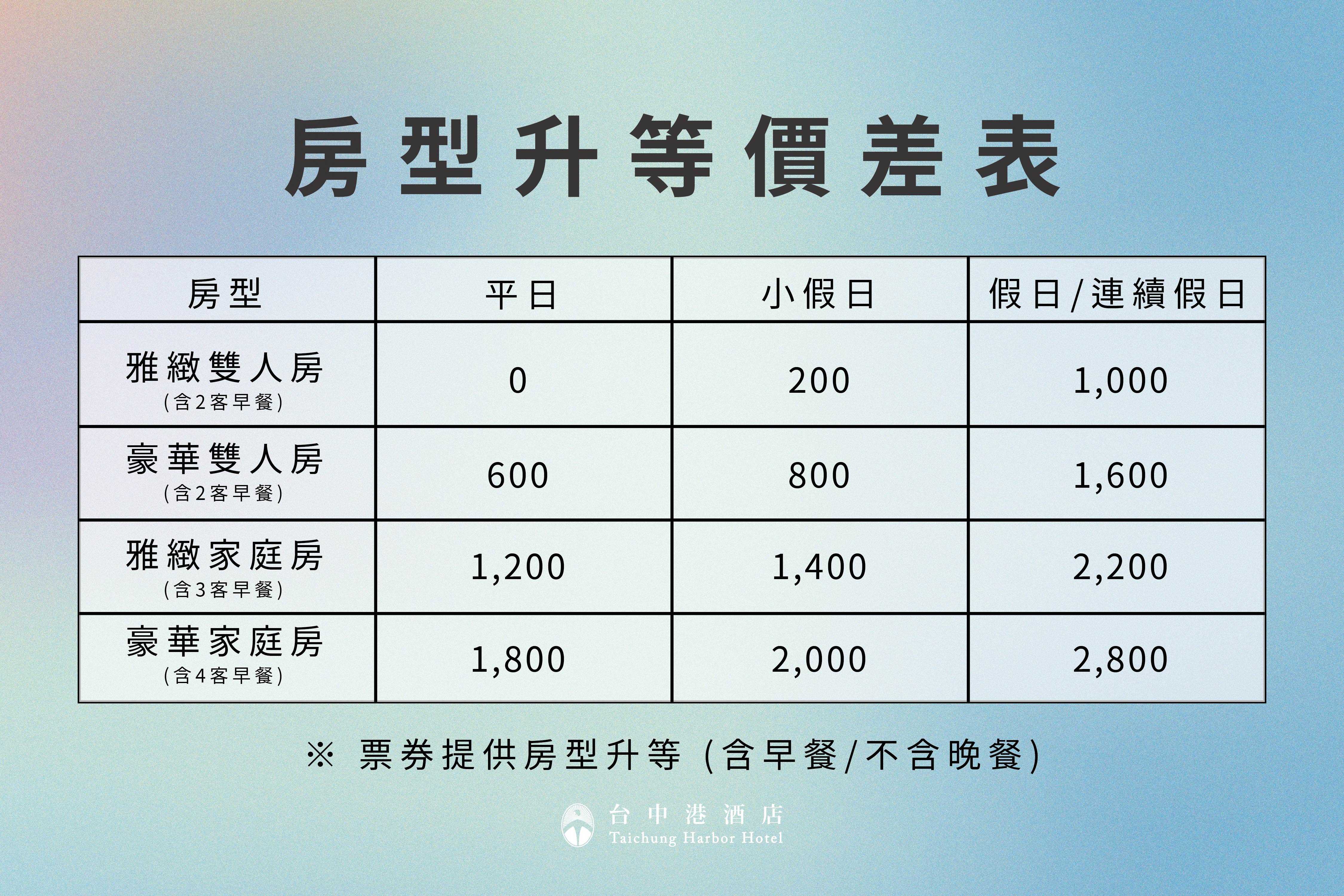 8. 本券可於優惠效期內依房型升等價差表加價升等,詳見官網公告。