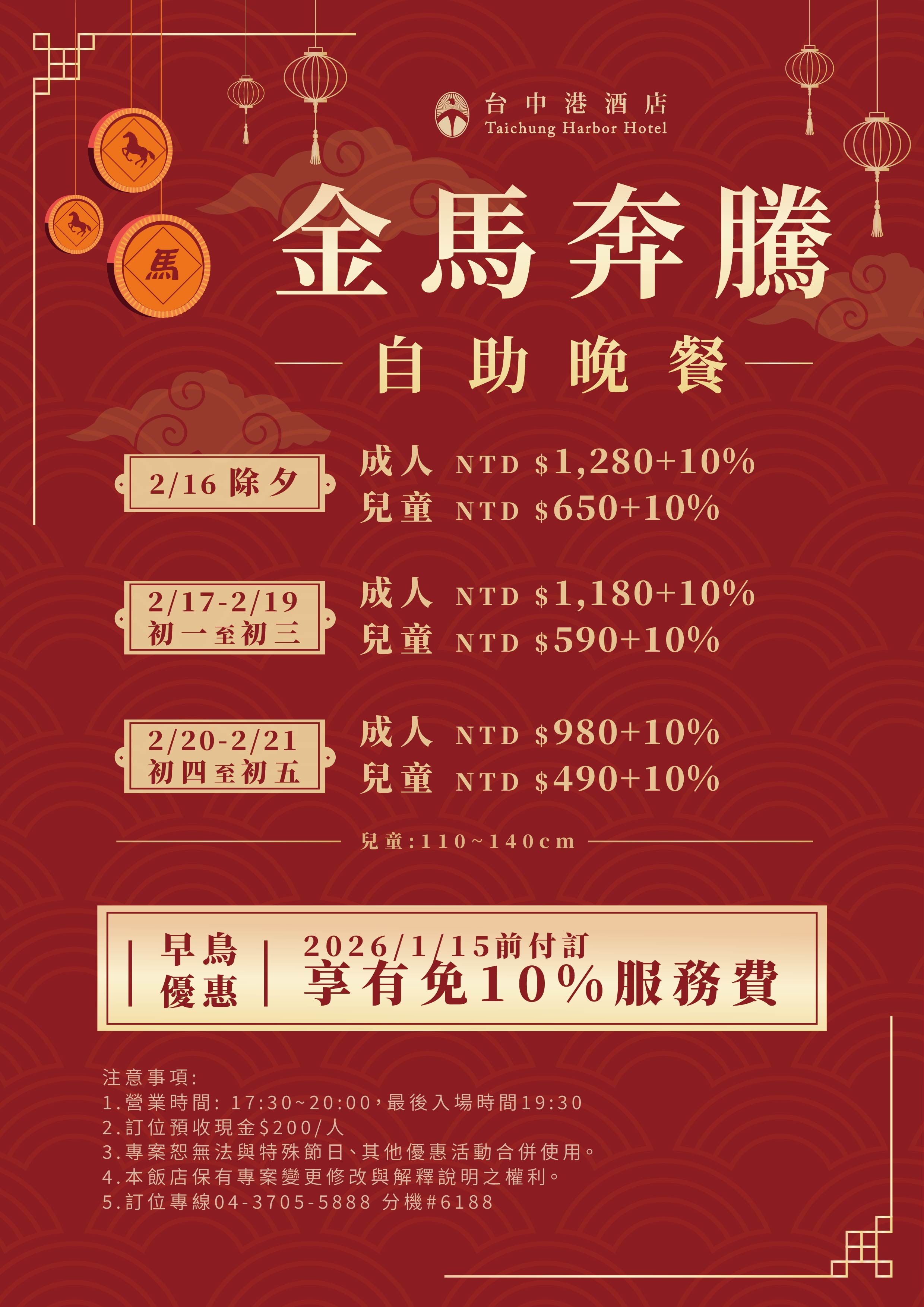 - 營業時間: 17:30~20:00,最後入場時間19:30 - 訂位預收現金$200/人 - 專案恕無法與特殊節日、其他優惠活動合併使用。 - 本飯店保有專案變更修改與解釋說明之權利。 - 訂位專線04-3705-5888 分機#6188