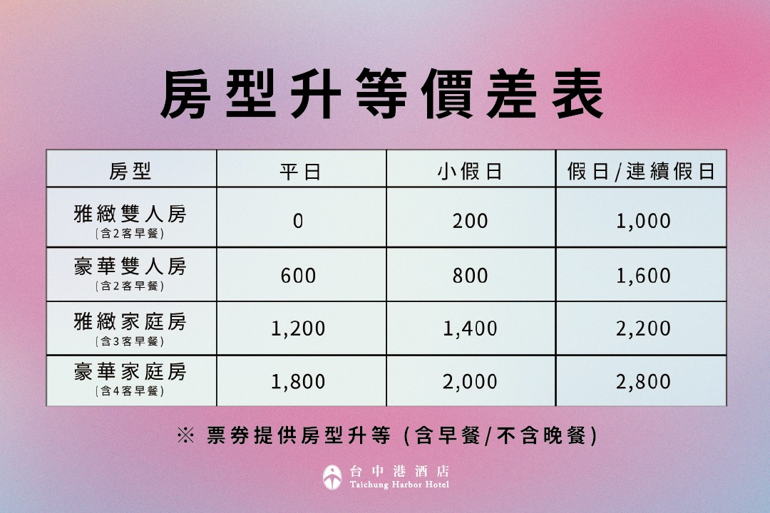 本券可於使用效期內依房型升等價差表加價升等,房型升等包含早餐,無晚餐;平日、小假日、假日、連續假日定義依酒店官網公告為準