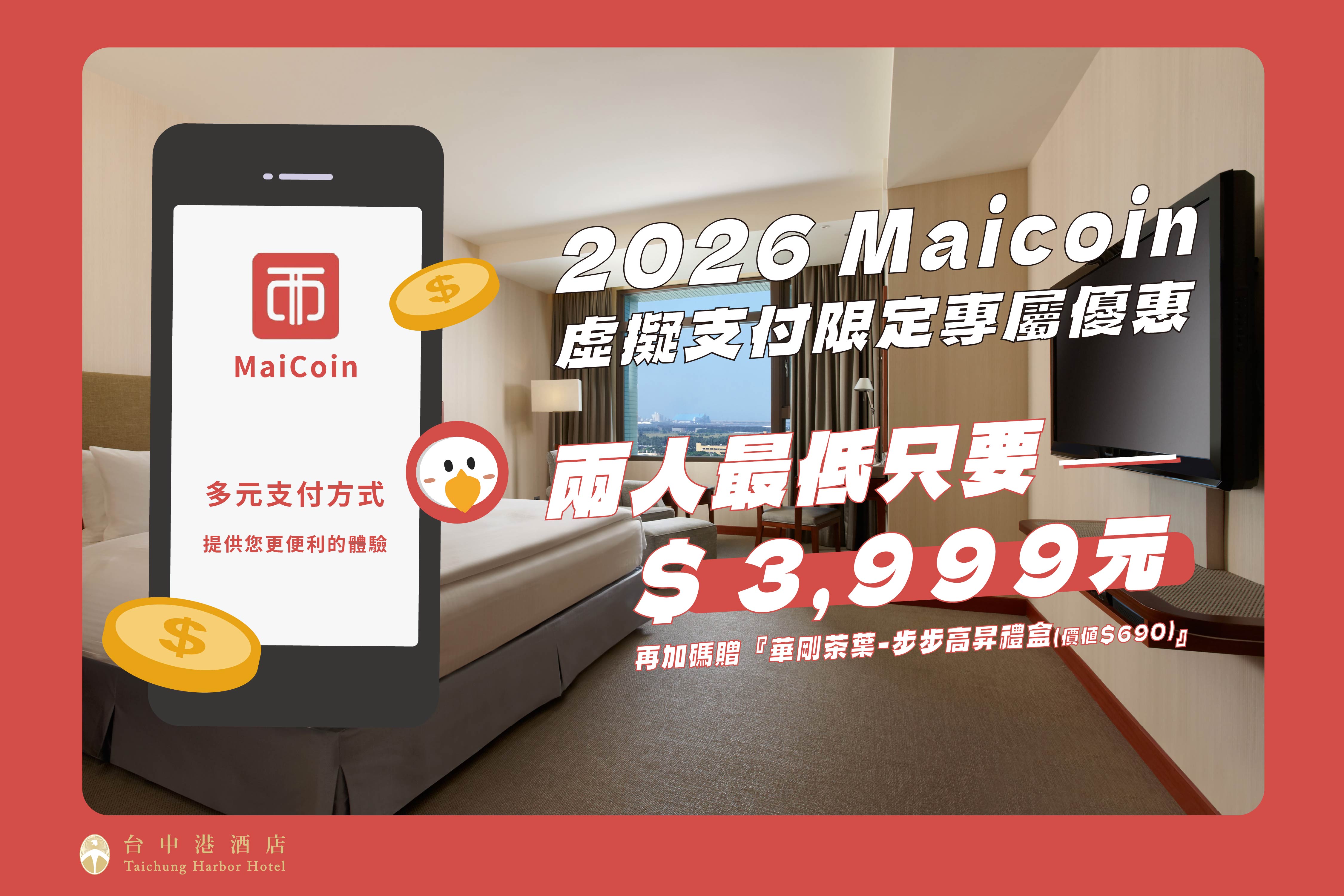 台中港酒店為支持金融科技發展,推出Maicoin虛擬支付訂房服務,讓旅客可使用加密貨幣輕鬆完成住宿付款。無論是商務出差或休閒旅遊,都能享受安全便利的數位支付體驗。